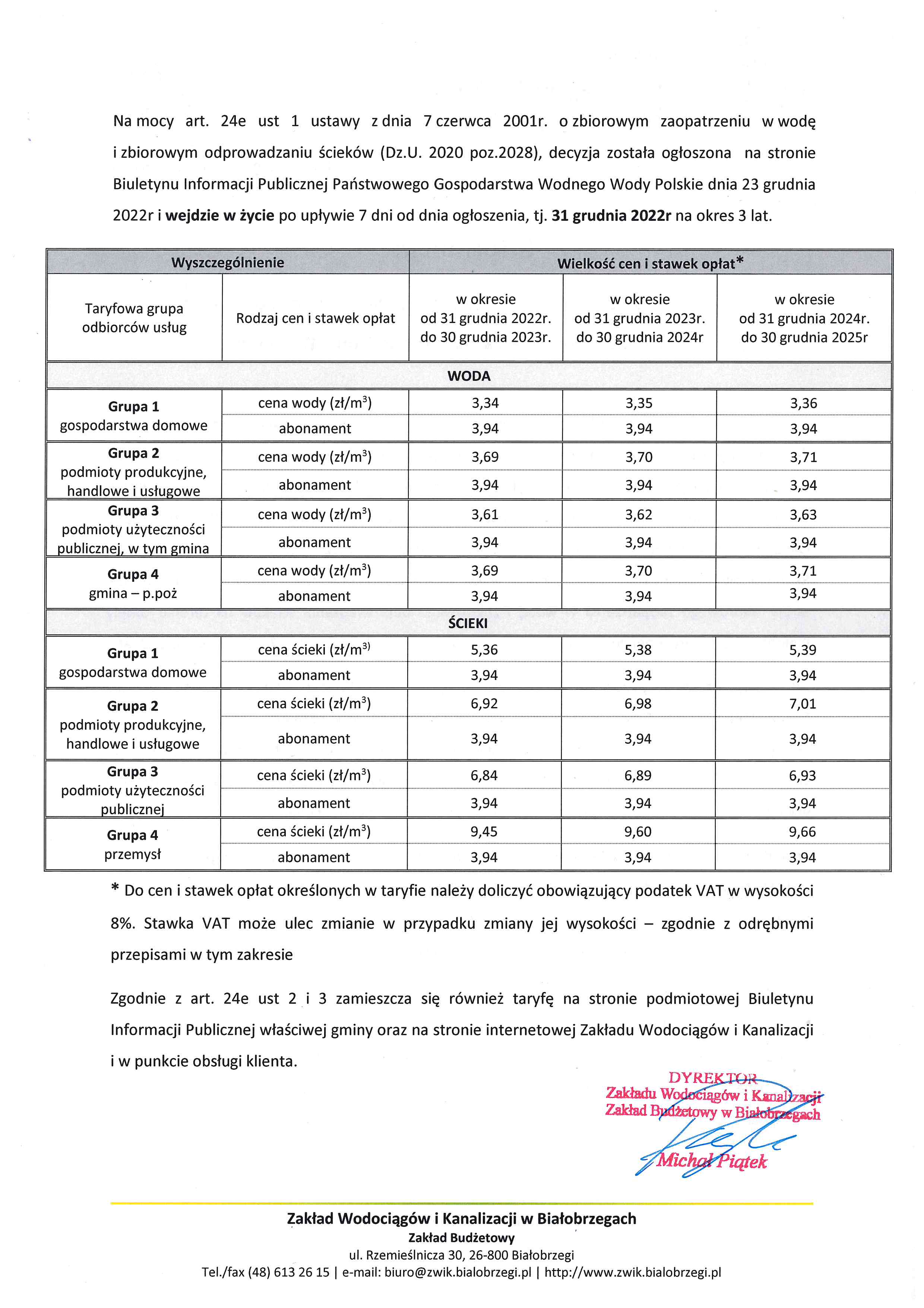Komunikat ZWiK w Białobrzegach w sprawie zmiany taryf